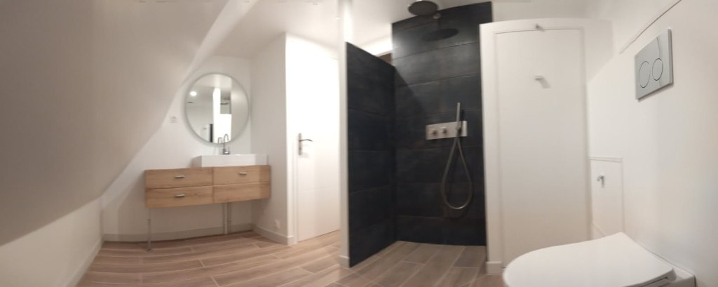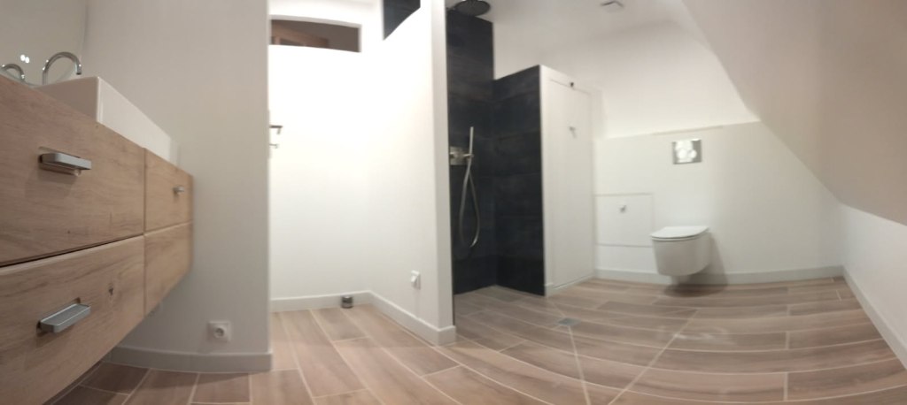 Un exemple de rénovation complète d’une salle de bain avec un changement de carrelage et une pose de plaque de plâtre.